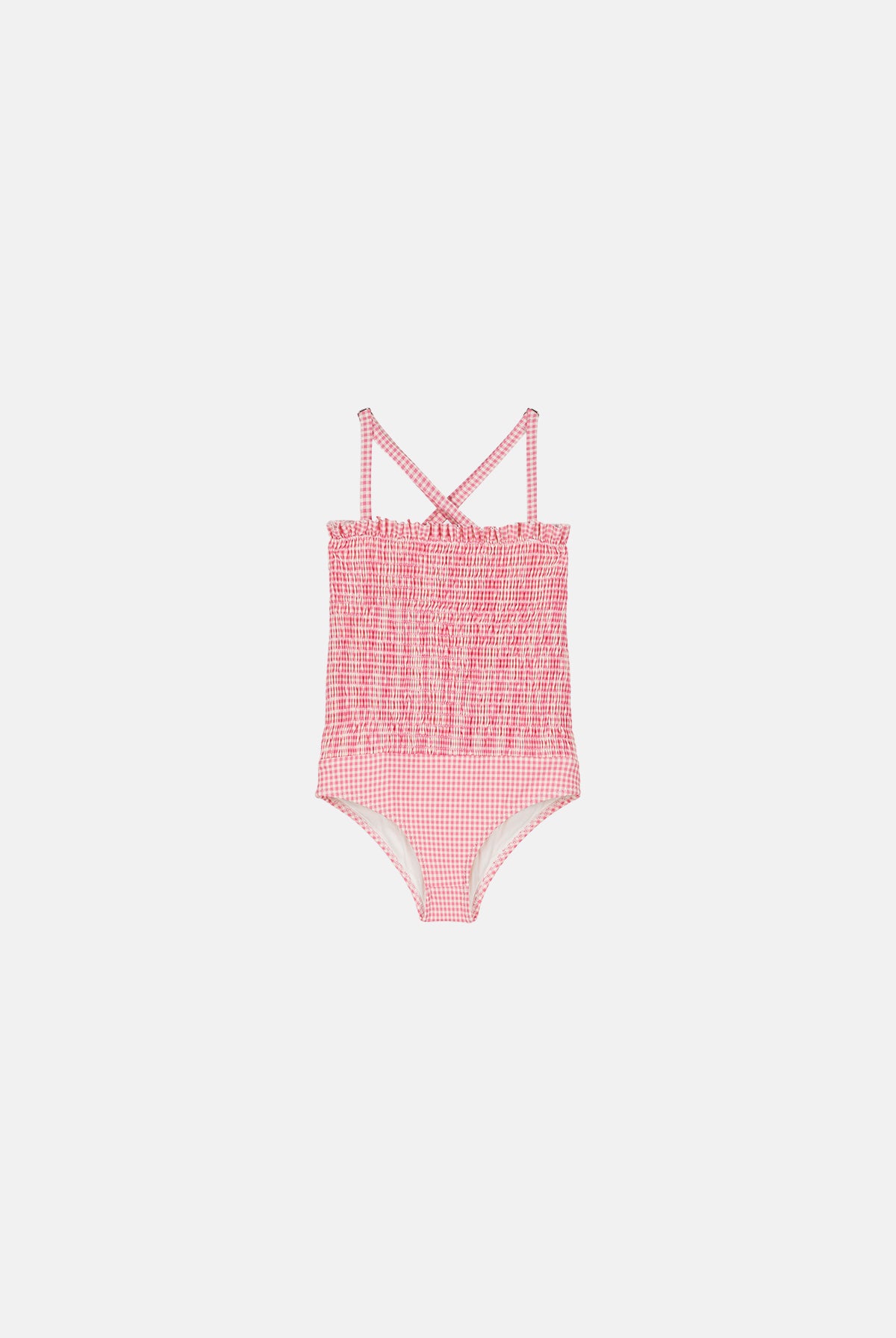 • One-piece bathing suit with smocked top and ruffled rims.
