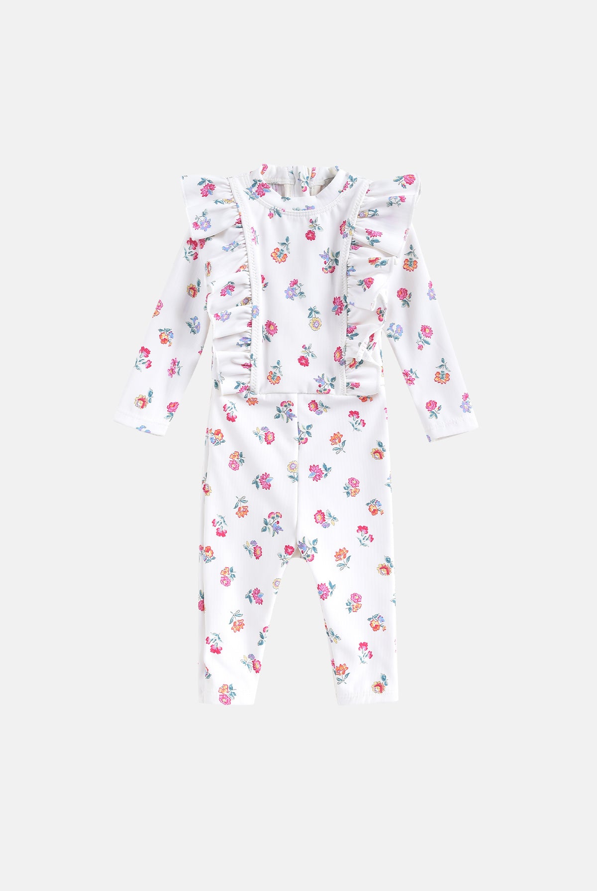 • Full-body surf-style bathing jumpsuit with ruffled details at the front.