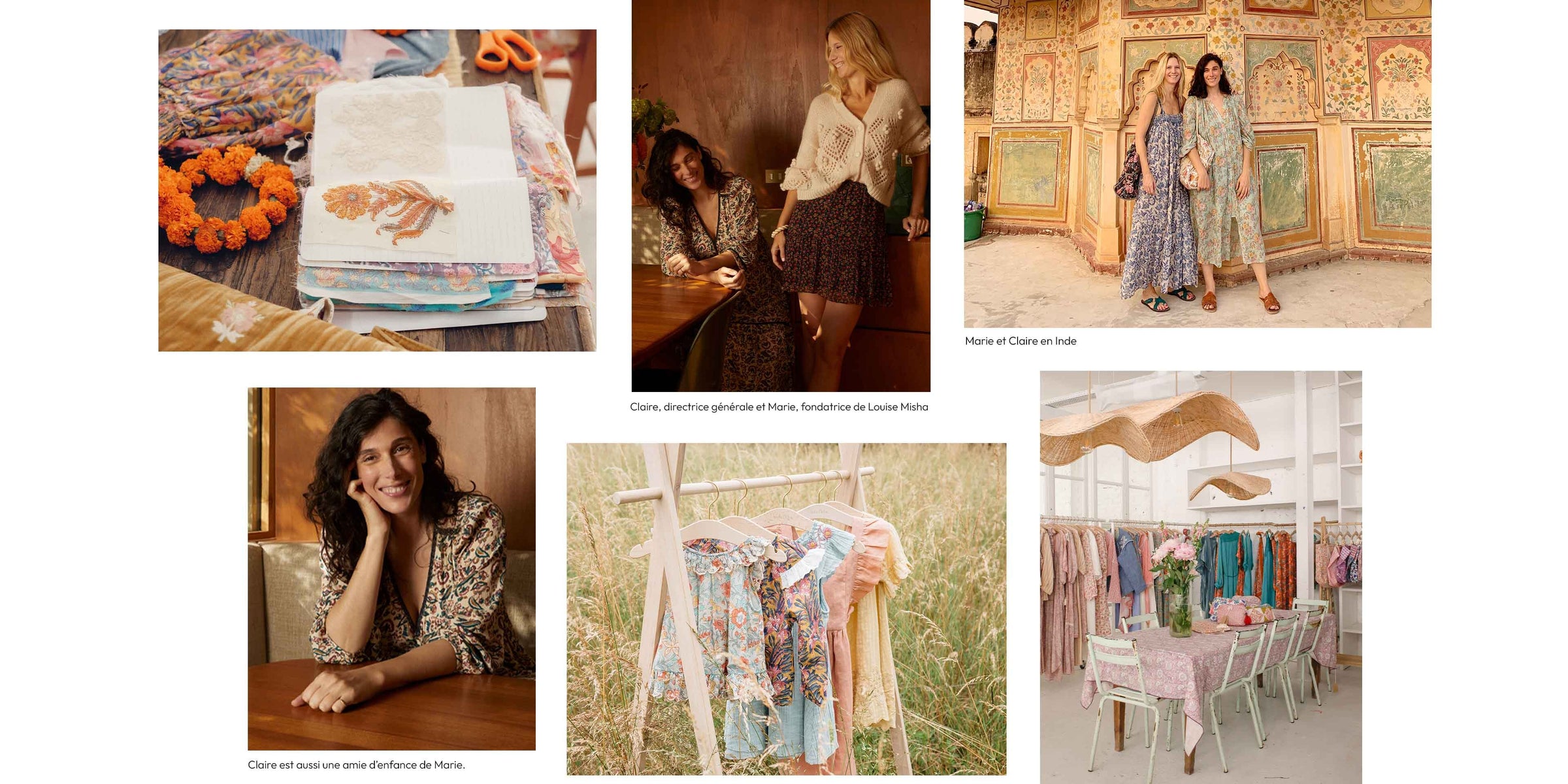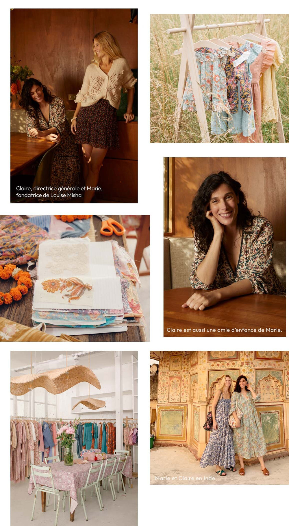 Avec l’aide de son amie d’enfance et associée Claire Moulin, Marie continue jour après jour de tisser ce voyage bohème, guidé par beaucoup de douceur, de curiosité et une grande ouverture d’esprit. C’est une extraordinaire aventure humaine qui rassemble une équipe soudée et bienveillante, des ateliers talentueux et respectueux, des savoir-faire exceptionnels et un amour du fait-main, et des clientes fidèles qui font vibrer le cœur de Louise Misha.