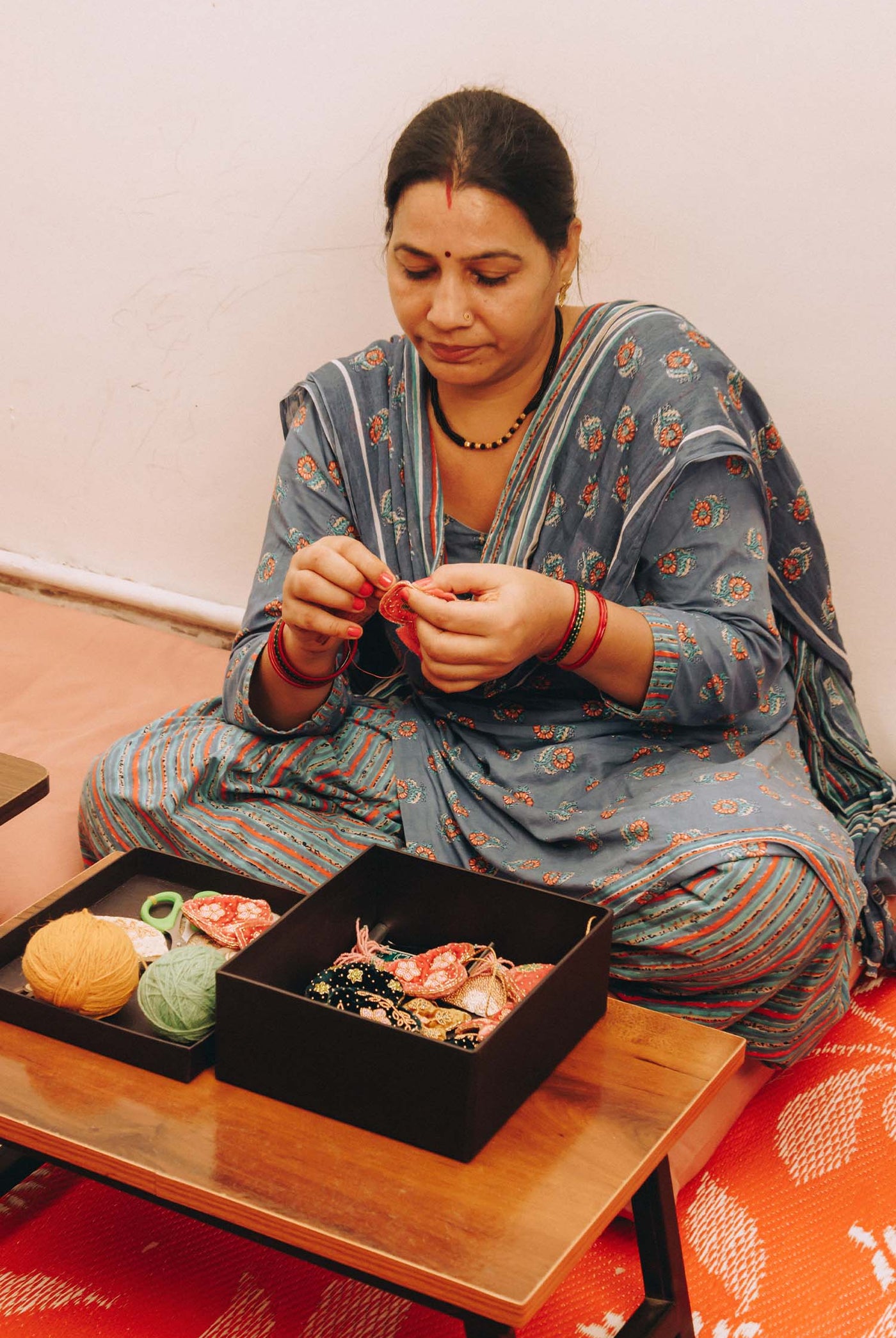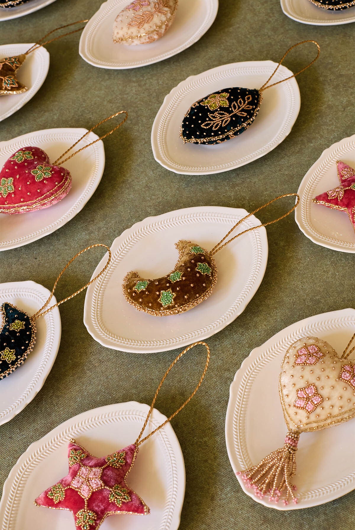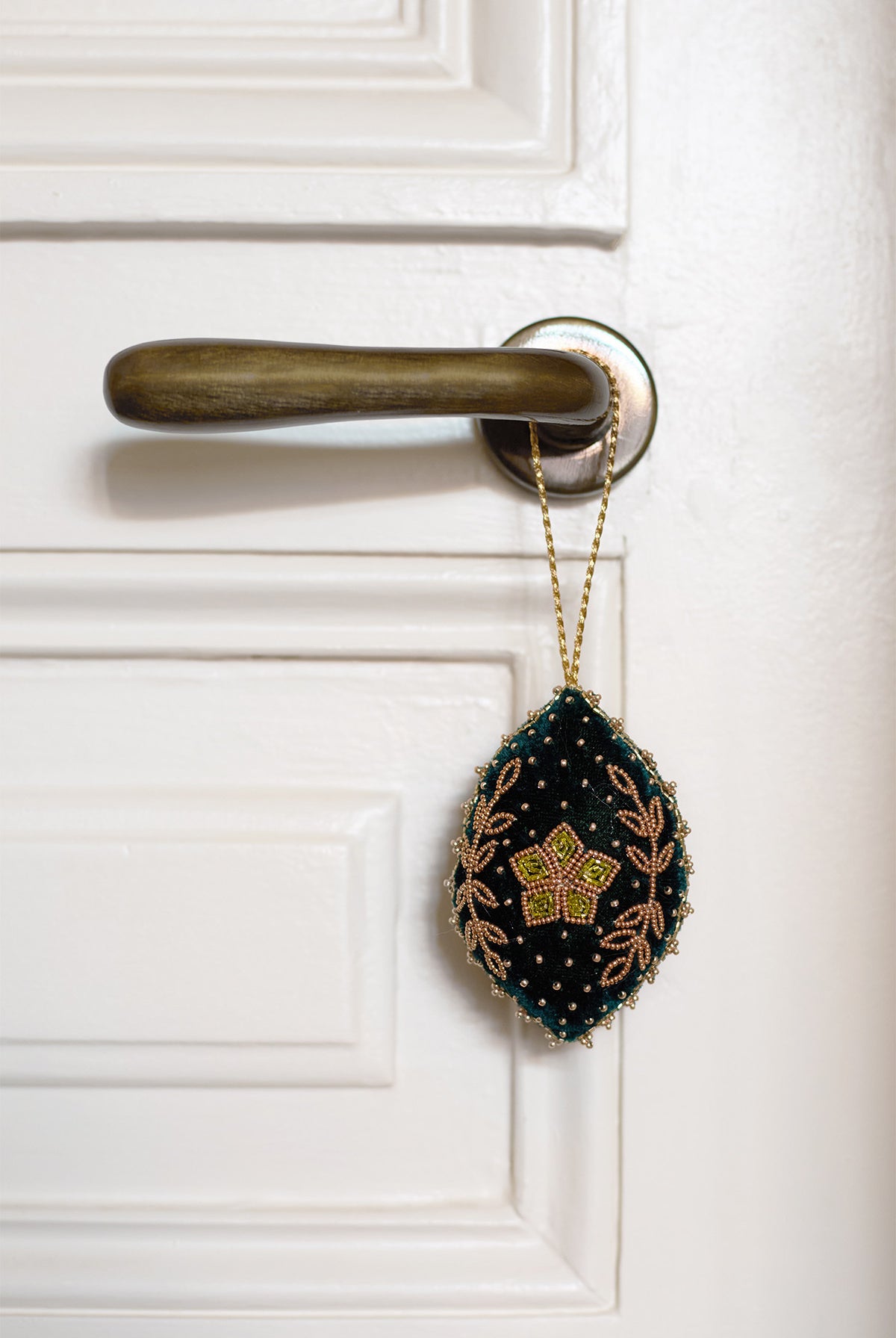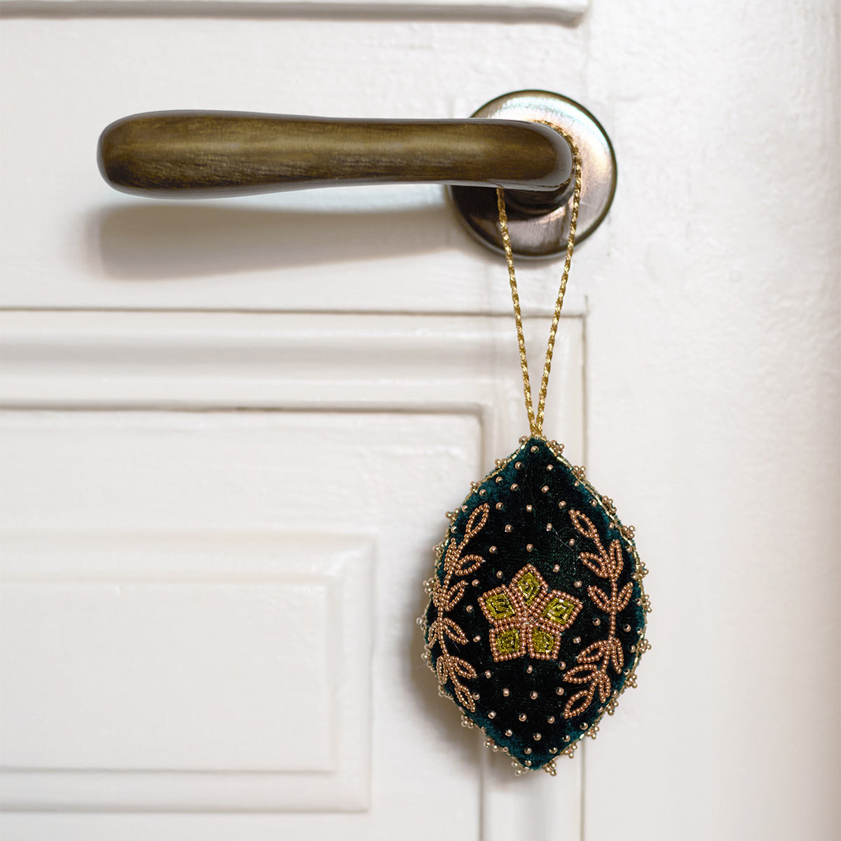 Les perles sont brodées à la main sur le velours selon la technique artisanale indienne du Ari. Le tissu est ensuite découpé et rembourré à la main avec des chutes de laine recyclées. Chaque pièce est embellie de perles cousues, d’un pompon perlé et d’un cordon tressé pour la suspendre. Chaque étape est artisanale, faisant de ces créations de véritables bijoux, nés d’un travail minutieux.