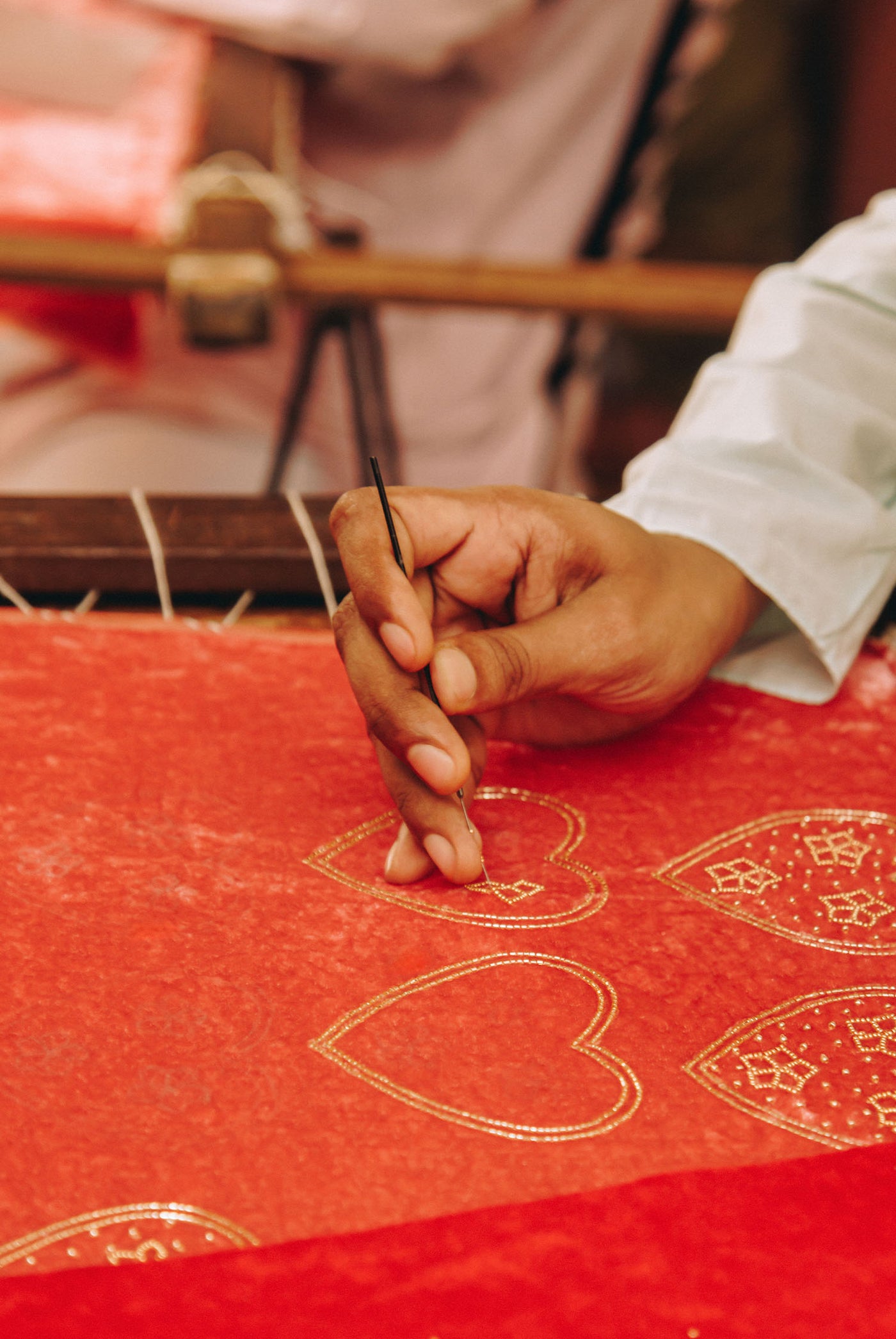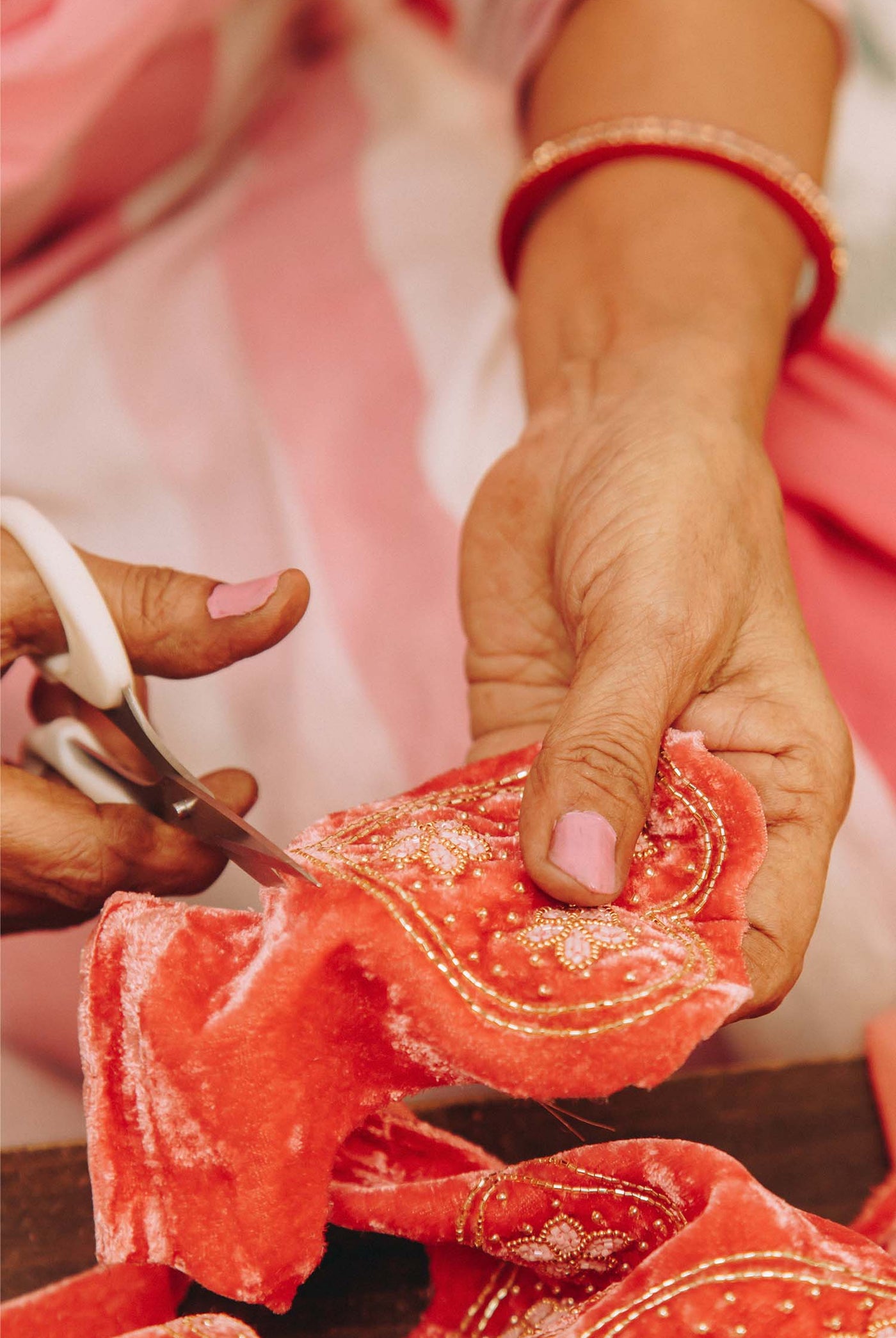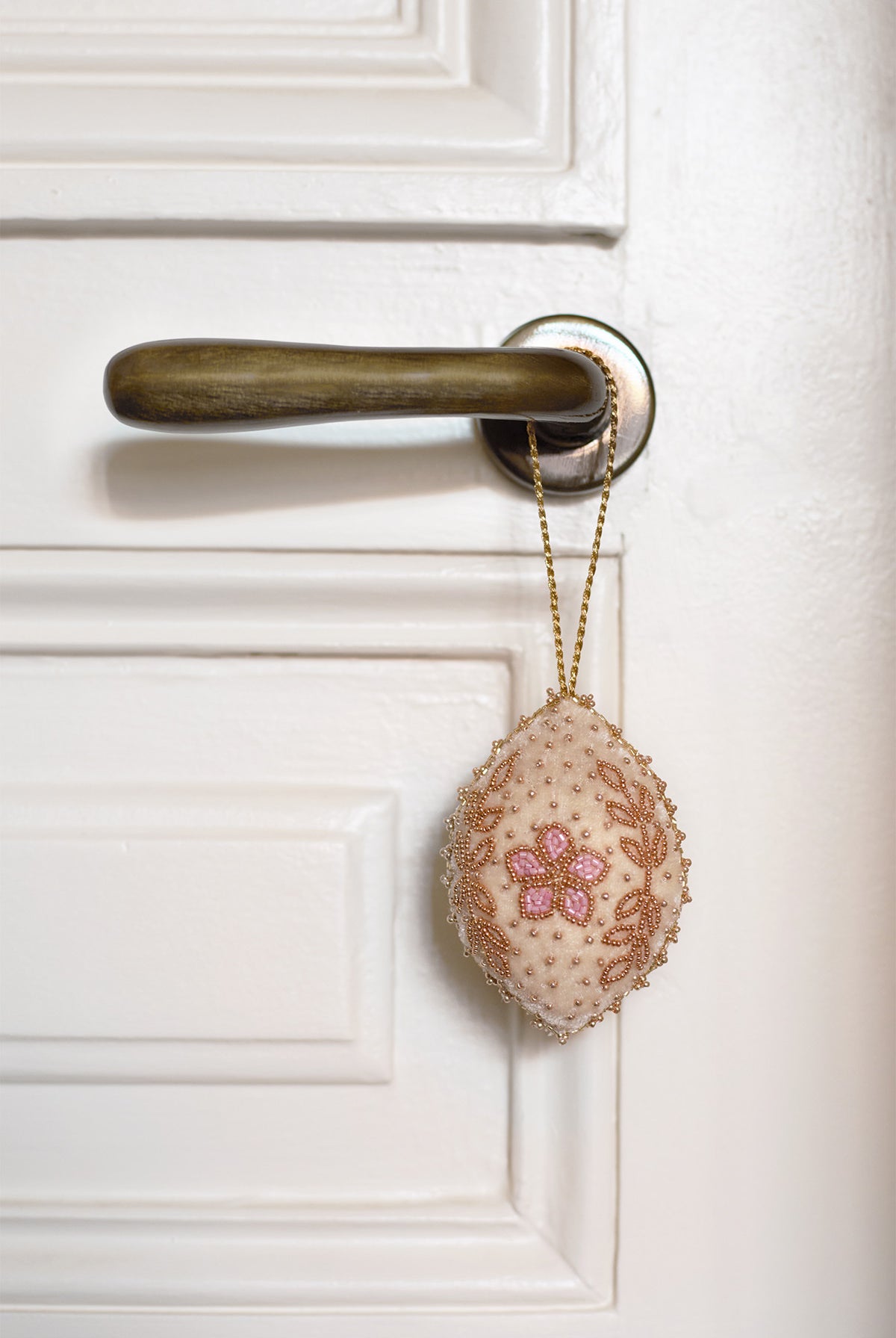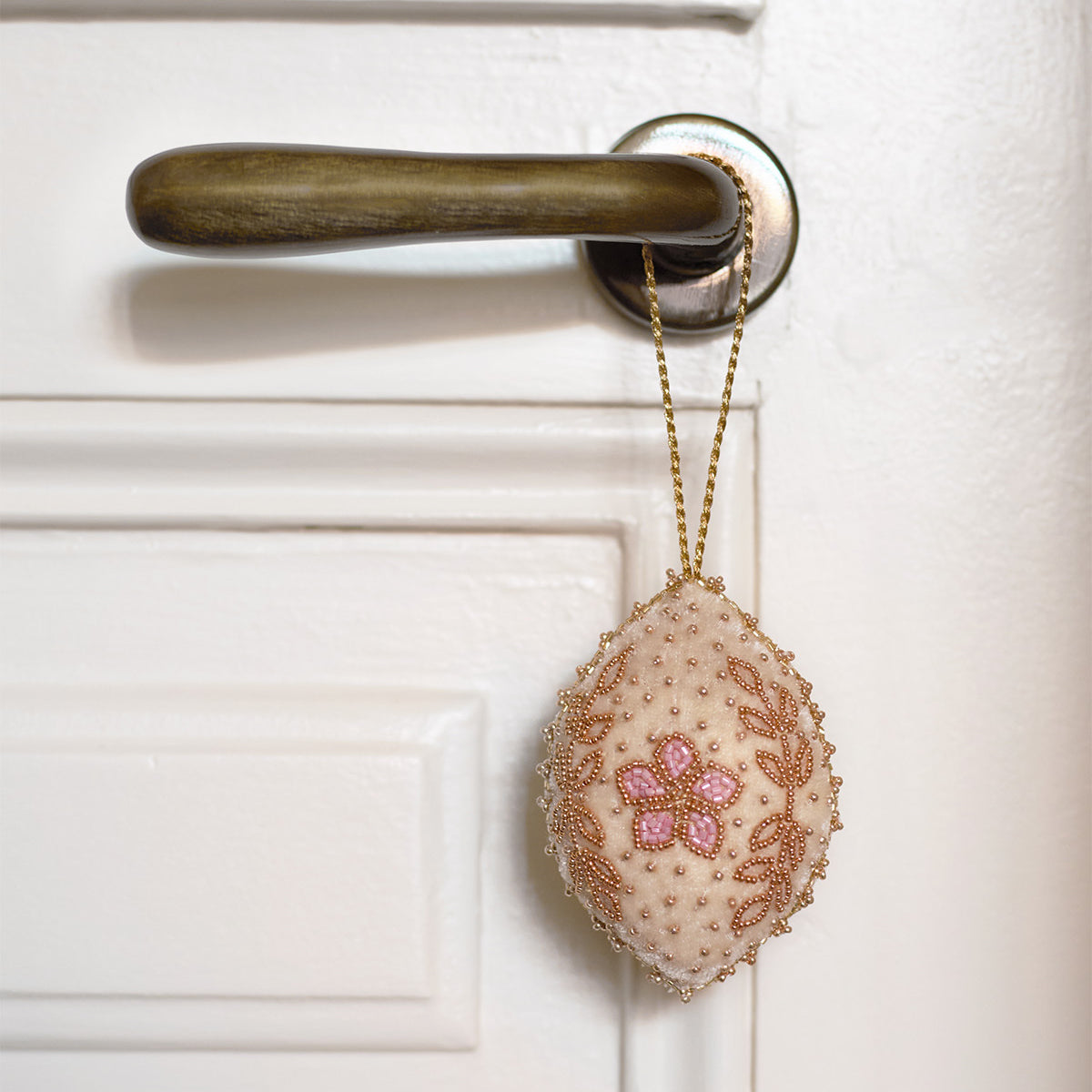Les perles sont brodées à la main sur le velours selon la technique artisanale indienne du Ari. Le tissu est ensuite découpé et rembourré à la main avec des chutes de laine recyclées. Chaque pièce est embellie de perles cousues, d’un pompon perlé et d’un cordon tressé pour la suspendre. Chaque étape est artisanale, faisant de ces créations de véritables bijoux, nés d’un travail minutieux.